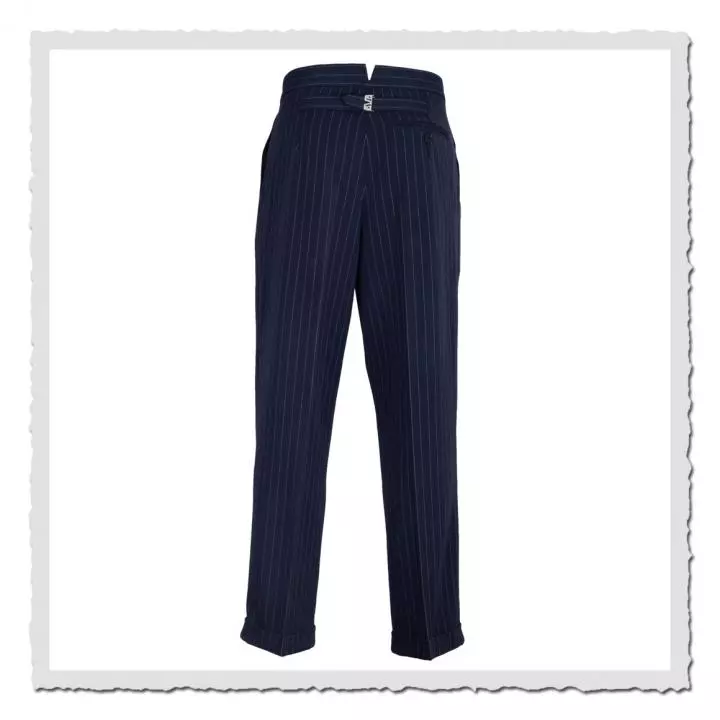 Die Hochbund-Hose Franz im Stoff ocean navy ist eine klassische Hochbundhose, wie sie Mitte der 1920er modern wurde und bis in die 1950er hinein modisch poplär war.