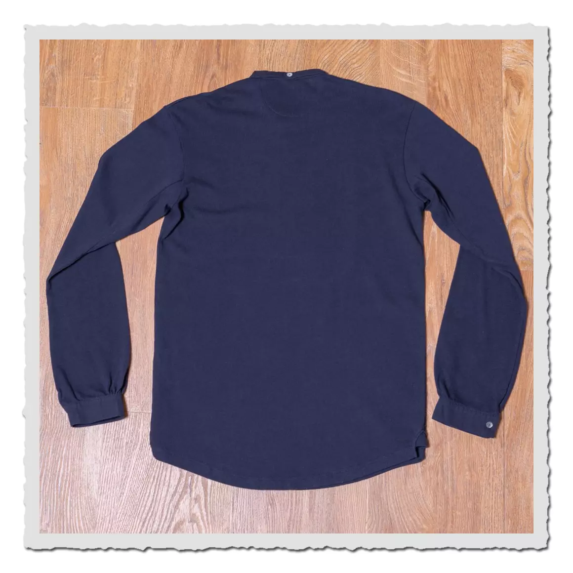 Authentisches Arbeitshemd des frühen 20. Jahrhunderts mit gestreiftem Brusteinsatz und Perlmut-Knöpfen. Im Nacken ist ein zusätzlicher Knopf um einen Kragen anknöpfen zu können.