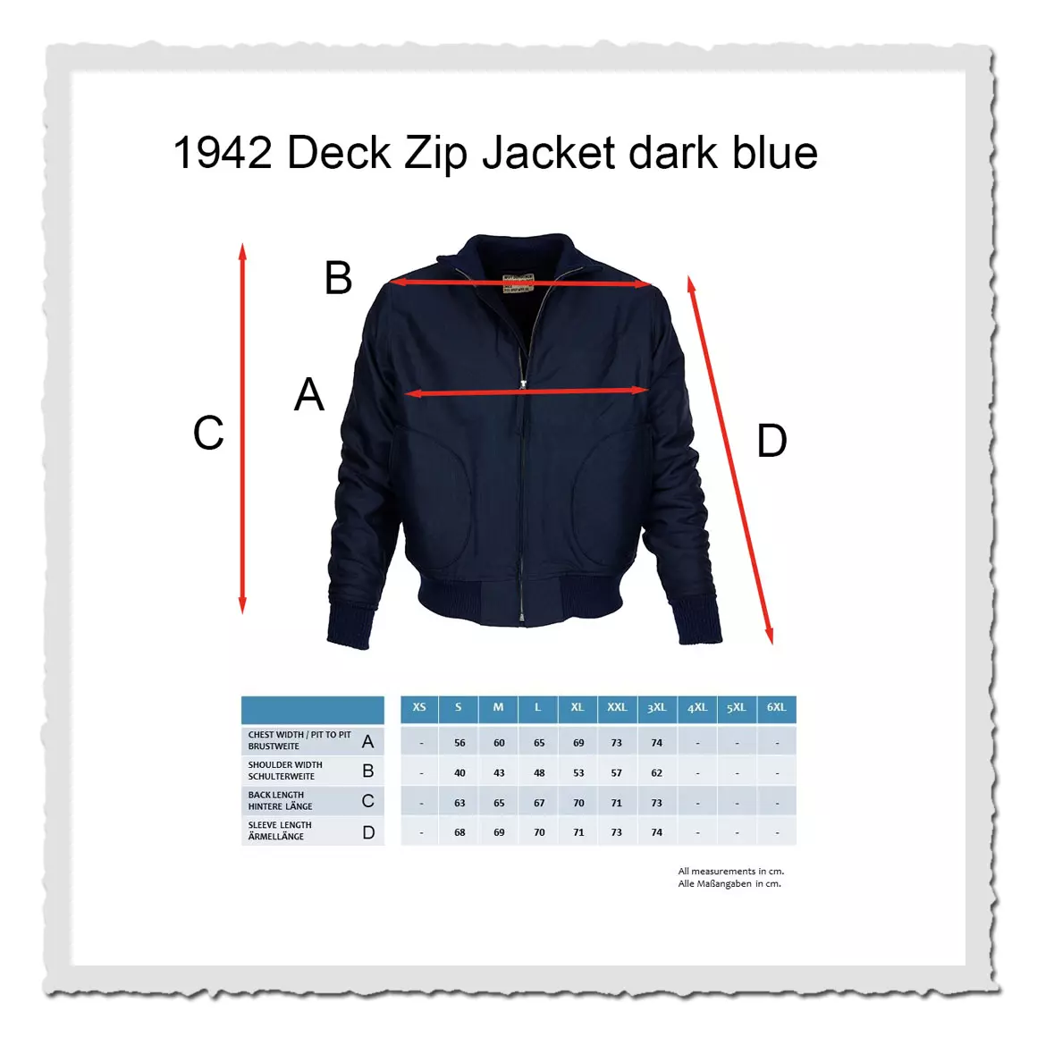 Die Deck Zip Jackets wurden von 1939 bis 1942 von der U.S. Navy ausgegeben. Als Außenmaterial hatte die Deck Zip Jacket das bewährte "Jungle Cloth" aus 100% Baumwolle. Um die Seeleute vor der Kälte zu schützen waren original Jacken mit einem Wolldeckenfutter ausgestattet.