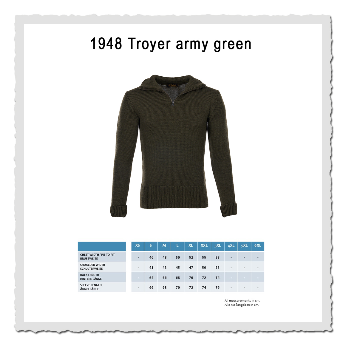 Vielleicht verdankt der Troyer seinen Namen der englischen Stadt Troy Town. Es gibt aber auch Hinweise gibt, dass der Begriff aus dem Plattdeutschen stammt. Eines steht fest: Der Troyer wurde traditionell aus reiner Wolle gestrickt, da dieses Material wasserabweisende und wärmende Eigenschaften besitzt. Selbst bei Nässe hält Wolle warm und schützt so vor Kälte und Wind – entscheidend für Arbeiter, die tagelang auf hoher See waren.