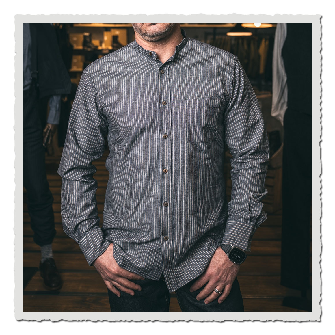 Dieses slim fit-geschnittene Oberhemd von Pike Brothers mit einer durchgehenden Knopfleiste geht auf ein historisches Vorbild aus den Roaring 20s zurück. Der kurze Stehkragen bot die Möglichkeit, einen weiteren eleganteren Kragen anzuknöpfen. Zur damaligen Zeit war es oft der sogenannte Vatermörder-Kragen. Das abnehmbare Add-on gab dem Hemd nicht nur einen formelleren Charakter, es erleichterte auch das Reinigen und Stärken des Kragenteils, der stärker in Mitleidenschaft gezogen und schneller dreckig wurde. Bis in die 1940er erfreute sich diese Art von Hemden großer Beliebtheit, bis sie mehr und mehr von den bis heute weit verbreiteten Modellen mit Umlegekragen, die fest mit dem Hemd verarbeitet werden, verdrängt wurde.